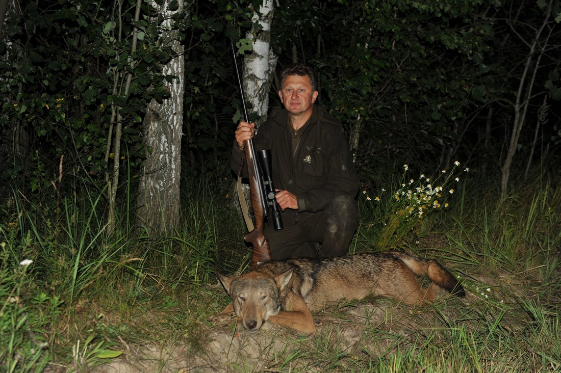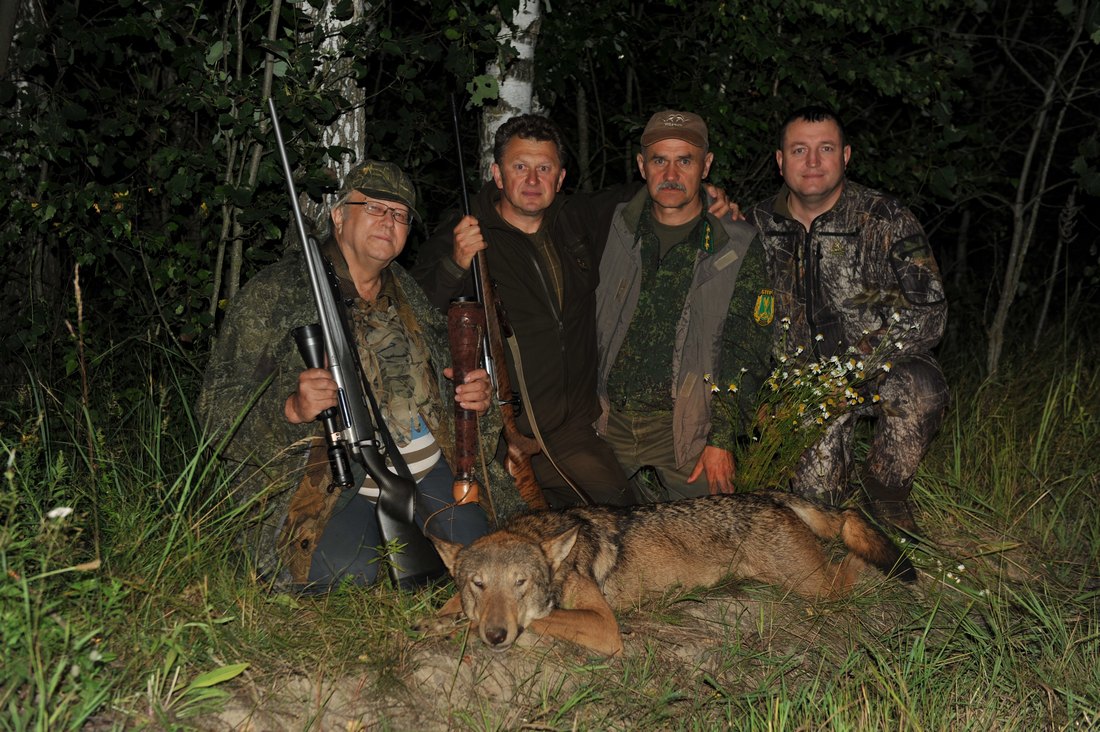 Мы, Новик Л.М., Светлый Н.В. и Танкович А.Б., засветло заняли свои позиции на небольшом поле в трехстах метрах от болота. Приняли решение, что вабить будет Леонид Михайлович. После третьей вабы появился волк напротив Николая, но что-то почувствовав неладное, быстро исчез в высоком травостое.