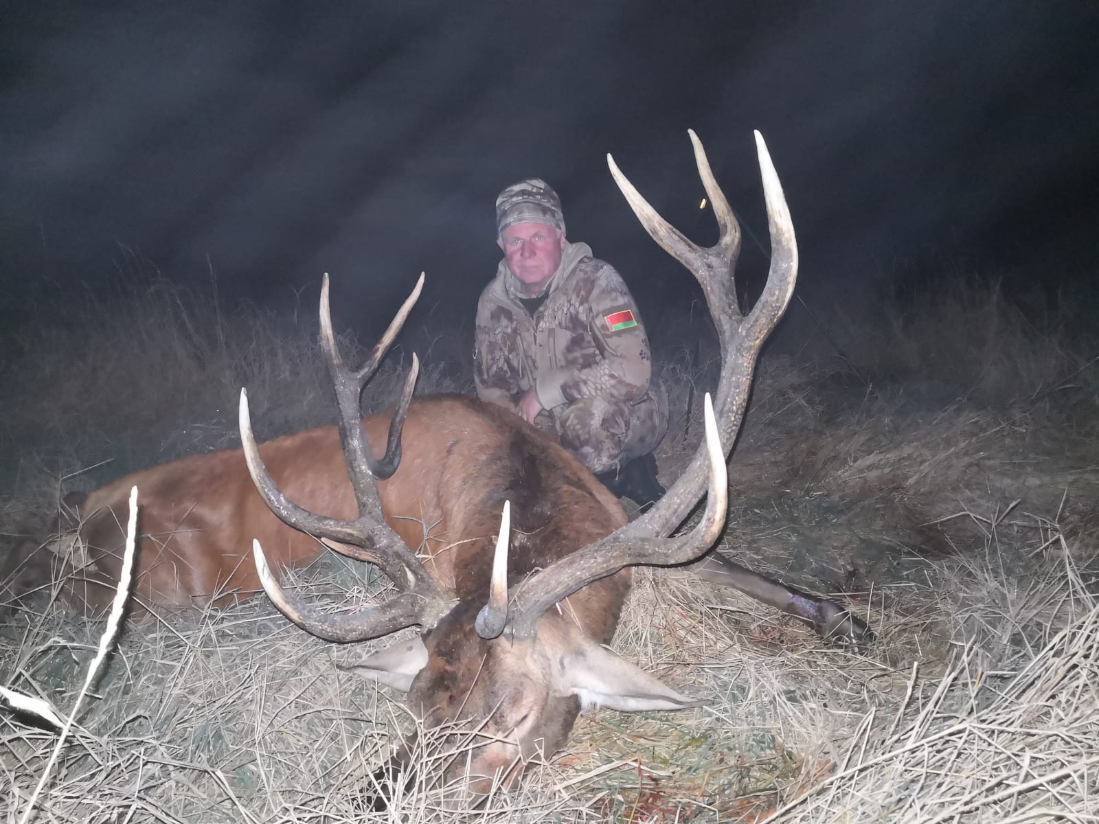 По ощущению я попадаю на место с менее выраженной растительностью и в прицел на расстоянии 210 и удаётся неплохо рассмотреть взрослого оленя с индивидуально выраженным задним отростком короны правого рога. В это время слева приблизительно на таком-же расстоянии начинают появляться детали второго быка, рассмотреть которого не позволяют высоко торчащие поросли репейника. Неожиданно в этой визуальной кутерьме рисуется частокол левой короны оленя, как минимум с 5-ю высокими отростками. «Он» — мелькнуло в голове, и все внимание на передвижение зверя. В разрыве репейника появляется голова зверя, основание шеи, выстрел, хлопок попадания… Непонятные движения при полной тьме засвеченного вспышкой выстрела ночника вынуждают для прояснения ситуации приложиться к тепловизору, который визуализирует ещё левее точки прицеливания стоящего бокового оленя. Быстрый поиск зверя в прицел, выстрел, хлопок попадания, опять непонятная движуха при кромешной тьме и тишина.