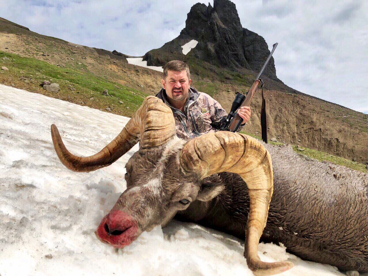 Это уже третья моя поездка на Камчатку. И на конец-то баран добыт. Проведённая заранее разведка способствовала этому. Но, все равно в каждой охоте есть свои нюансы. Утром ранний подъем и выход в горы. Под покровом низко висящих туч, забрались на вершину сопки. В один миг облака разошлись, засияло солнце и мы увидели баранов. Расстояние более километра. Начали делать подход. Проводник Антон планировал, что архары перейдут каменную осыпь и выйдут к нам на расстояние выстрела. Долго тянулись минуты ожидания. Принимаем решение идти к рогачам на встречу. По дороге начинают предательски свистеть сурки. Целый концерт устроили. Была-бы моя воля, перестрелял бы всех. Добрались до спасительного камня. Внизу замечаем небольшого толсторога, 200 метров до него. Виктор по рации говорит, что есть хороший трофей выше этого. И вот чубук появляется из-за хребта. Дистанция 300 метров. Баран, скорее всего из-за свиста сурков, почуял не ладное и стал уходить от нас на верх. Принимаю отчаянное решение стрелять по бегущему. Промах. Вот он остановился, быстрый замер дистанции — 386 метров. Корректировка барабанов на прицеле. Выстрел. Баран пошёл. И только сейчас до нас донёсся шлепок, архар, как подкошенный падает в ущелье. Трофей добыт! «Горная пятерка» взята!