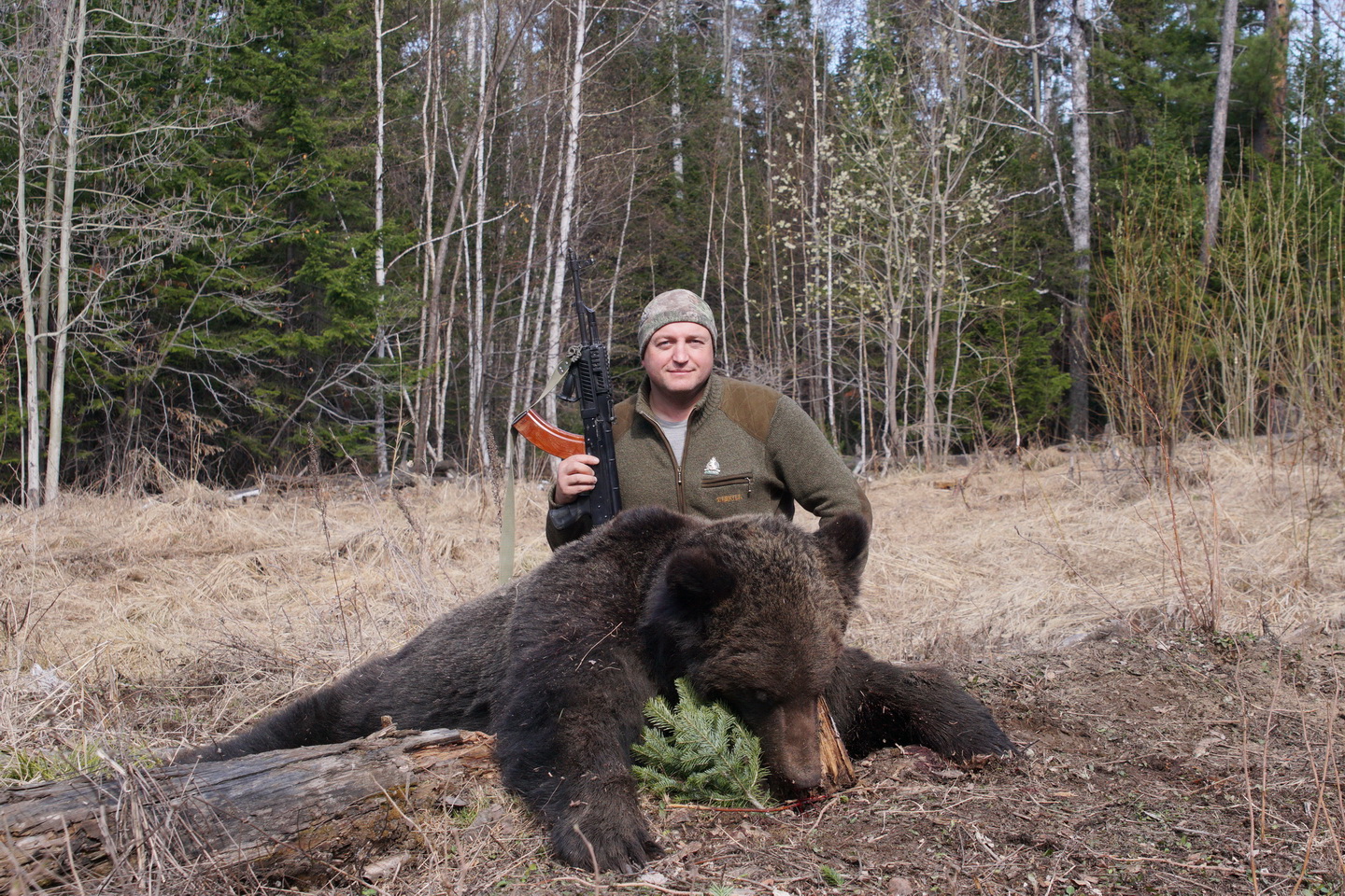 Много раз рассматривая медведей в трофейных комнатах своих друзей в моей душе не возникало желания заиметь такой-же. Все изменилось, когда на загонной охоте ко мне вышел Мишка, сел на задние лапы и мы несколько минут смотрели друг на друга с расстояния в 25 метров. Начал искать варианты и этой весной появилось предложение охоты в Бурятии. На сборы ушло несколько дней и на майские праздники я прилетаю в Улан-Удэ. В аэропорту меня встречает местный охотник Анатолий и мы сразу отправляемся в тайгу. Наша дорога идёт вдоль транссибирской магистрали в сторону озера Байкал. От станицы Посольской до зимовья, 15 километров, добираемся на квадроцикле. Как раз подошло время выдвигаться на лабаз. Первое, что удивило — расстояние до привады всего 45 метров. Так тихо мне ещё не приходилось сидеть никогда. Возможно сыграло свою роль 24 часовое бодрствование в дороге, но силуэт зверя появившейся через несколько часов за привадой поразил мое воображение своими размерами. Матёрый Медведь не вышел на чистое, а стал по кустам обходить полянку в тайге по периметру. Дойдя до нашего заходного следа он заревел и мы его больше не увидели. На утро проверили вторую приваду, там тоже были следы активного посещения, решили испытать удачу здесь. В первых сумерках на чистое вышел взрослый Медведь и удачный выстрел завершил мою охоту. Хочется поблагодарить Анатолия за тёплый приём и прекрасно организованную охоту.