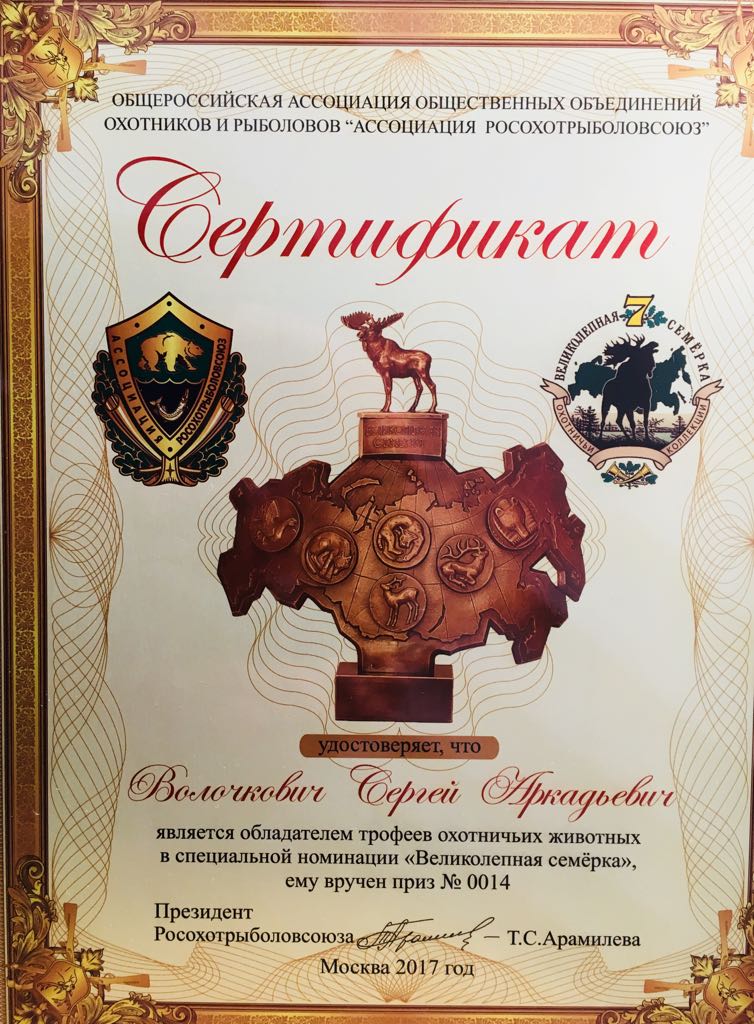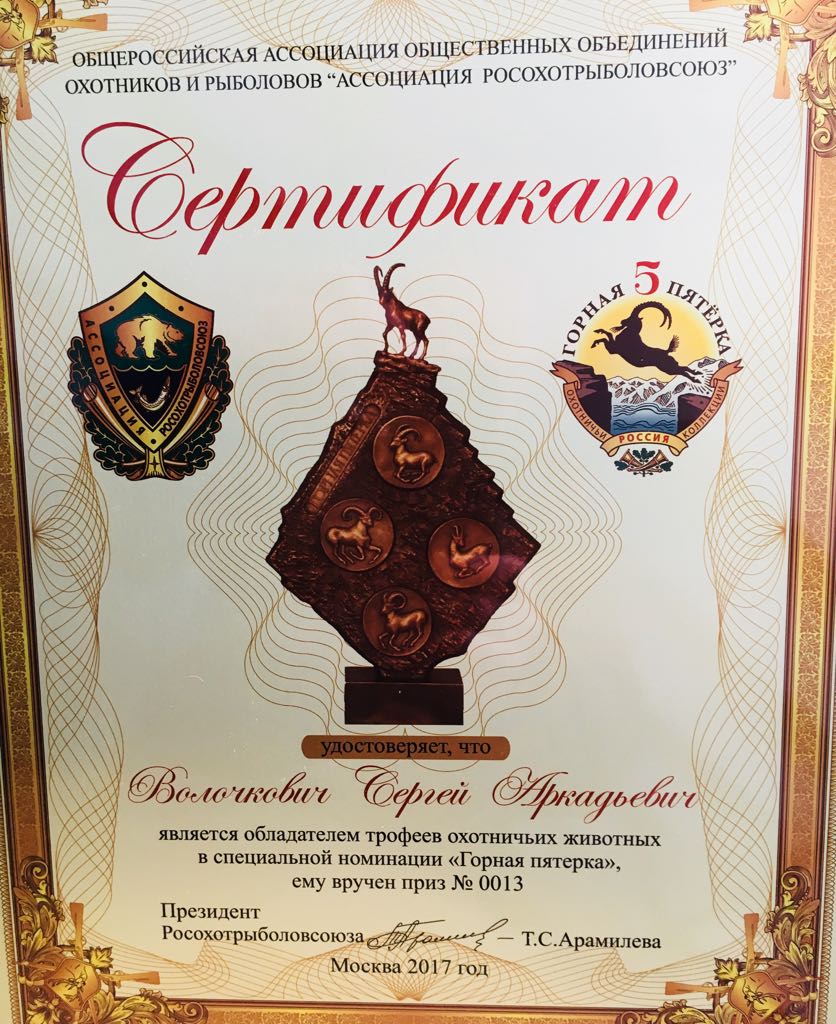 Приятно отметить, что на данном мероприятии наш одноклубник Волочкович Сергей был награжден двумя призами Ассоциации «Росохотрыболовсоюз» — «Великолепная семерка» и «Горная пятерка». Награды были вручены президентом Ассоциации — АРАМИЛЕВА Татьяна Сергеевна. Так же Сергей Аркадьевич был награжден призами КГО «Большой кавказский приз. Серебро» и «Российский кавказский приз. Бриллиант».