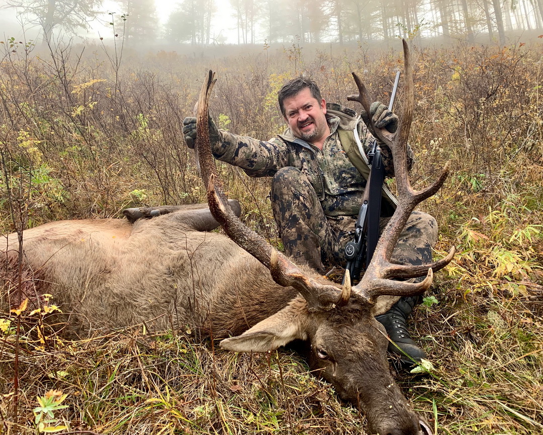 Идёт прямо к нам. Видимость хорошая. Дистанция 253 метра. И останавливается, внимательно смотря в нашу сторону. Надо стрелять. Ввожу корректировки в прицел. Выстрел. И сам не понял, что произошло. Вроде бы попал, но оптика в раз запотела. Толком ничего не вижу. Наспех протираю прицел. Олень стоит на месте. Быстро перезаряжаюсь, второй выстрел. Самец разворачивается и уходит. Видно, что ранен. Третий выстрел — выстрел отчаяния. Чистый промах. Вася кричит, что надо добирать, уйдёт. Туман сгущается. Дистанция около 300 метров. Быстро заново заряжаю карабин. Оптика запотевшая. С трудом нахожу в прицеле марала. Понимаю, что надо один хороший выстрел. Нажимаю на курок и вот он! Отчетливо слышу шлёпок. И самец падает как подкошенный. Наконец то. Марал на реву добыт!