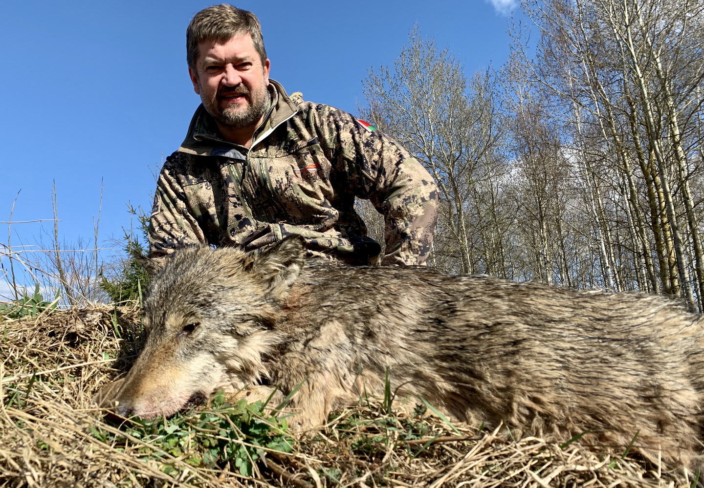 Первая ваба. Где в далеке что-то вроде бы отозвалось. А может кажется? Поле небольшое, одни зайцы на нем. 300 метров в одну и другую сторону. И вдруг промелькнул в лесу силуэт. Волк, лиса? Метров за 300 метров вышел из леса и зайдя под ветер двинулся к вабильщику. Так я точно стрелять не могу. Жду, как будут разворачиваться события. В это время между Ивановичем и Аркадьевичем нарисовались три силуэта. Кто это? Похоже кабаны. На вабу вышли? Лиса-волк дошёл до вабильщака 100 метров и сел. Тут его спугнули кабаны, и он развернулся и пошёл обратным своим следом. Лиса обычно так не делает. Высокая стерня не позволяет в ночник увидеть, кто же это? Силуэт двигается в мою сторону. И выходит на чистое место. Точно вижу в ночник — это волк! Времени на обдумывание нет! Надо стрелять. Вышку шатает, положение для стрельбы не устойчивое. Тут правый локоть находит своё место. Цель легла на мушку. Выстрел. Шлепка не слышу. Вижу — попал. Подходим, смотрим — самка матёрая! Как сказал, потом Войтех — считай семерых волков добыл. Дистанция оказалась 250 метров. Хороший ночной выстрел!