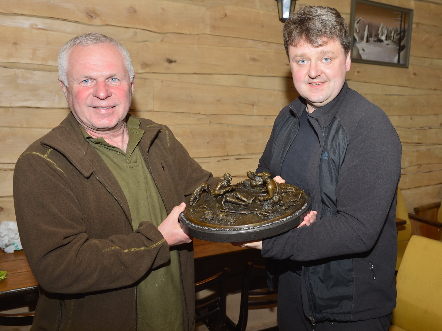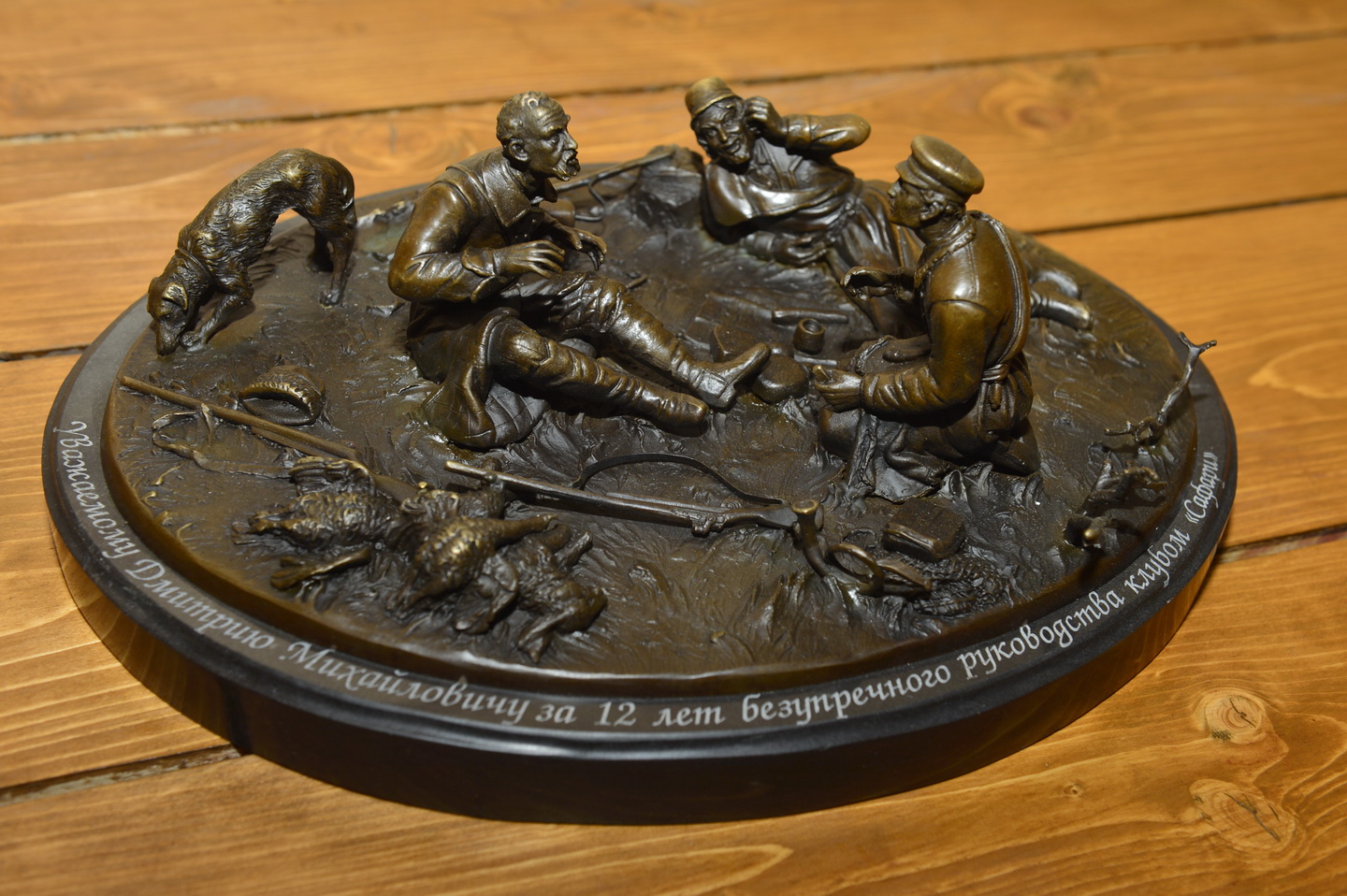 От коллектива Охотничьего клуба «Сафари», на память о долгом «председательстве», Богушу Дмитрию Михайловичу была вручена воспроизведенная в бронзе картина «Охотники на привале».