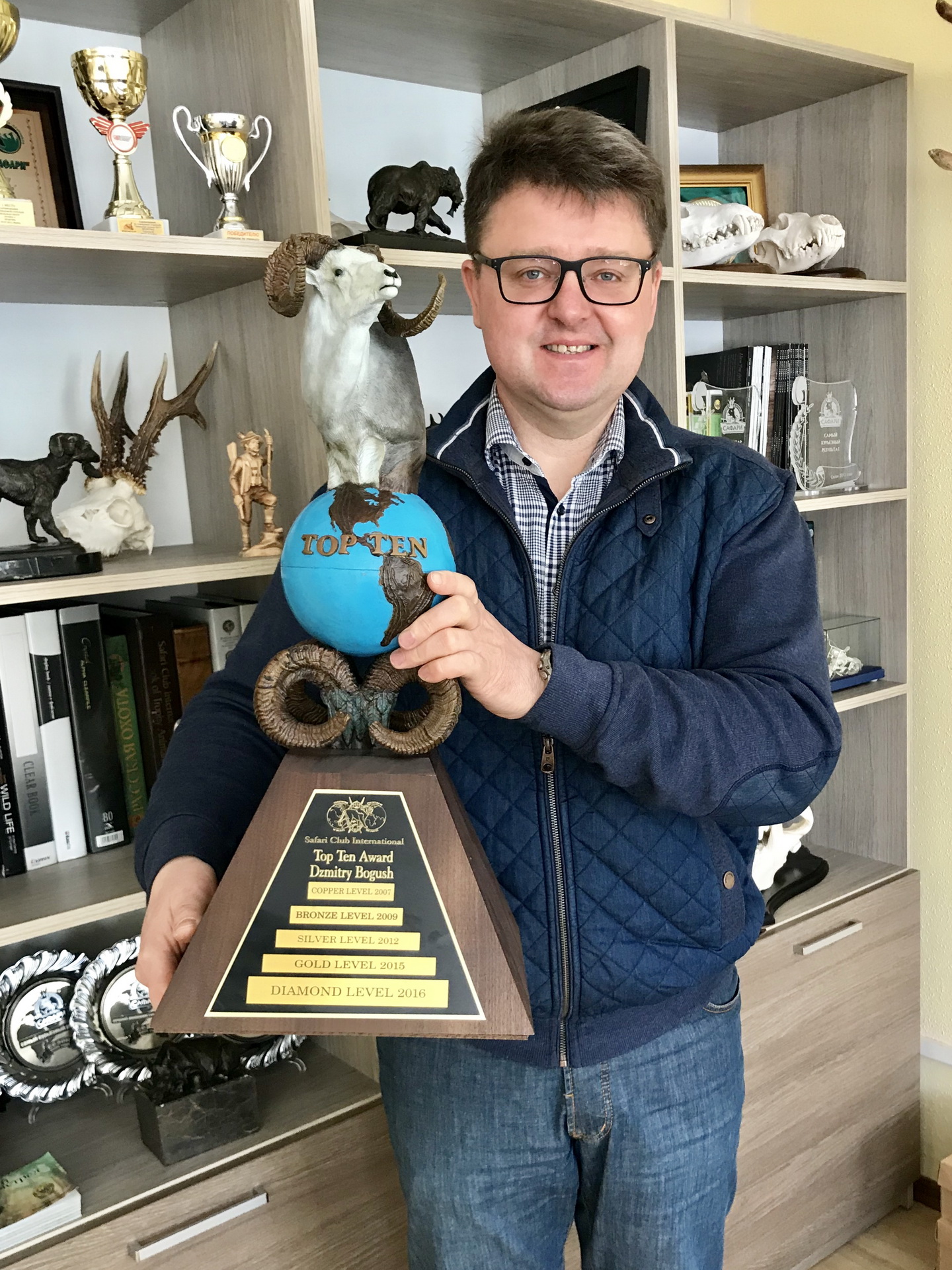 Дмитрий Богуш стал первым белорусским охотником, удостоенным награды “Top ten” наивысшего бриллиантового уровня. Этот приз учрежден международным клубом Safari Club International и вручается охотнику, имеющему не менее 15 трофеев, включенных в первую мировую десятку соответствующего вида. В настоящий момент 16 трофеев Дмитрия Богуша занимают достойные места в Top Ten SCI. От всей души поздравляем Дмитрия Михайловича с заслуженной наградой и желаем всем отечественным охотникам покорения новых мировых вершин.