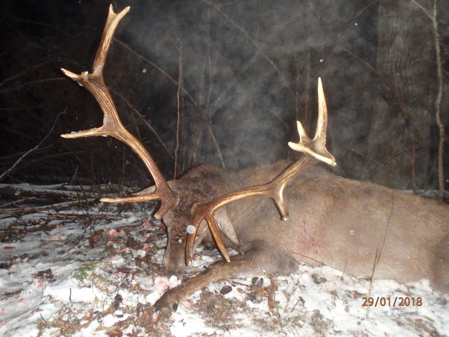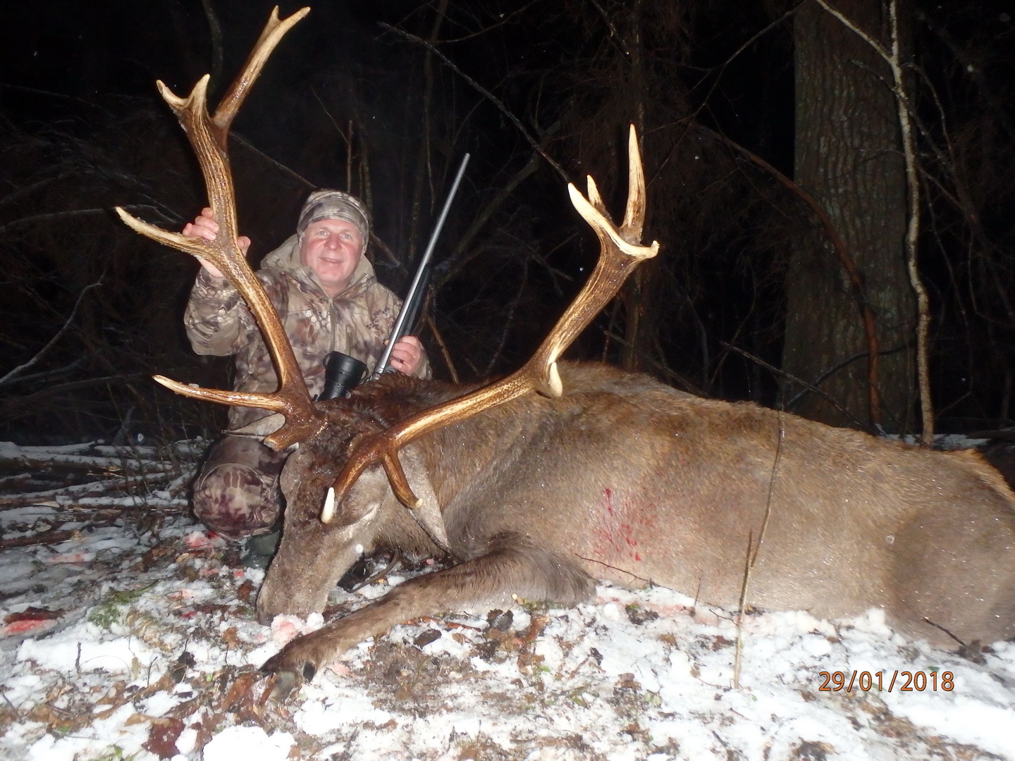 С учётом выездных поездок в этом сезоне поохотится на оленя не получалось. Под занавес сезона предпринимал несколько попыток, однако ничего интересного по трофею встретить не получалось. 29 января прогноз погоды ничего путного не обещал. Решил поехать к своему другу Тихоновичу Михаилу, егерю Осиповичского лесхоза после долгих согласований с охотоведом этого хозяйства на предмет разрешения на добычу трофейного оленя. Встреча, инструктаж, чайная церемония. У Михаила ещё охотники. Предложено попробовать охотится на подкормочной в глубине массива леса. С учётом неблагоприятного ветра вышка не очень обнадеживала. Выбрал стульчик у края делянки, на котором устроился около 17-30. Мокрый снег с дождём и порывистый ветер не обнадёживает. Выбрал вертикальное положение, чтобы промокать меньше. В 20-45 на площадку вышел зубр, затем ещё один, попытки согнать их игрой подсветки ночника -никаких результатов. Шансы не увеличиваются. Решил всё-таки, несмотря на тяжелеющую от дождя одежду, подождать. Ещё через час у края появляются три оленя. Первый, молодой, спокойно выходит к зубрам и начинает кормежку. Двое взрослых осторожничают по краю леса. Видимость так себе, но один явно выделяется высотой и раскидом, в какой-то момент удаётся визуализировать короны по 4 отростка. После выстрела за лопатками зверь прошёл около 350 метров. Несмотря на сквозное ранение по чернотропу добор его мог быть весьма проблемным. Спасибо Осиповичскому Лесхозу и моему другу и товарищу, опытнейшему егерю «Матросу» за охотничьи эмоции и радость «Дианы».