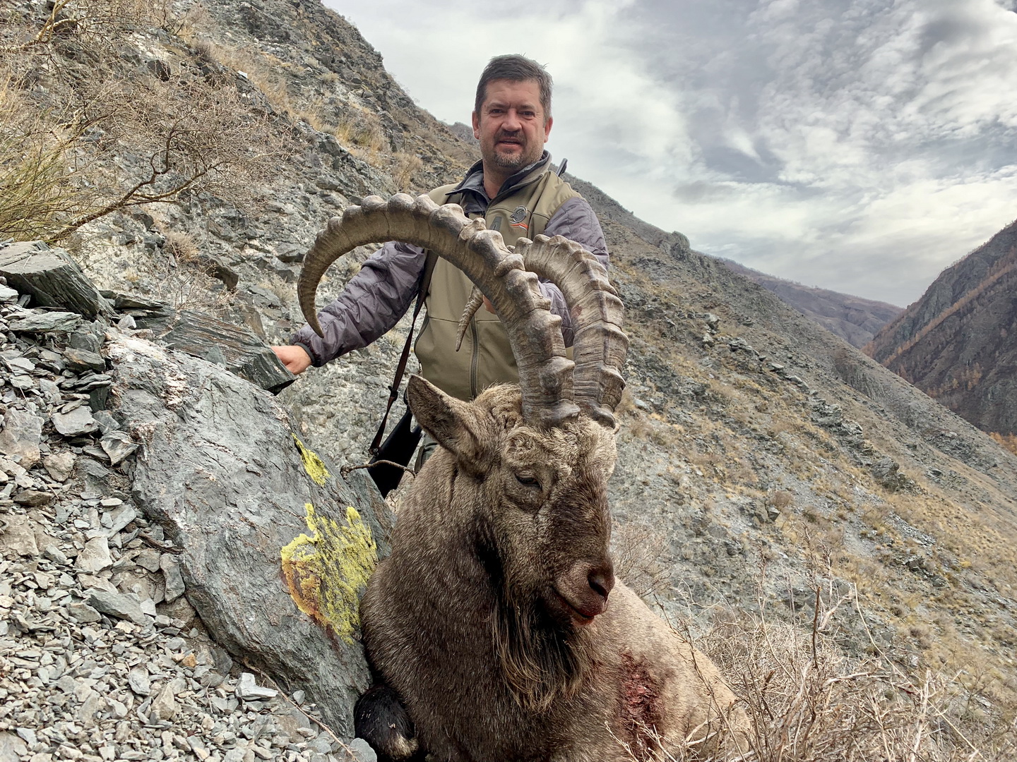 С вечера распределили егерей. Определились кто и где будет охотиться. Утром выезжаем на катере. Саша с Владимиром ушли немного раньше на открытой лодке. Не прошло и тридцати минут, как Войтех замечает на склоне группу козерогов. Среди них есть и трофейные самцы. Дистанция 350 метров. Войтех отказывается стрелять, ближе подойти нет возможности. Мы с егерем Василием продвигаемся вперёд, насколько это возможно и я пытаюсь найти удобное место для стрельбы. И тут Василий замечает двух самцов ниже основного стада. Дистанция 270 метров. Эх, надо было Войтеху идти! Но, уже поздно рассуждать. Надо стрелять. Корректировка барабанов. Выстрел. Эхо разнеслось по ущелье. Хлопок то ли был, то ли не было. Василий заметил, как козерог сжавшись пошёл вниз. И второй за ним. А вот второй вернулся назад. Я уже сложился стрелять, хорошо Василий вовремя остановил. Он увидел столб пыли за хребтом. Говорит, твой упал. А дальше крутой подъем в горы. Я иду к месту стрела. Крови не наблюдаю. А Василий уже нашёл мой трофей. Метров 30 прошёл. Попадание четко в лопатку. Трофей сибирского козерога в Саянах добыт! Очень быстро получилось, даже не знаю радоваться или огорчаться. Трофей есть, а сама охота минимально возможное время заняла. Не успел насладиться самим процессом. Это наверное мне за Алтай воздалось!
