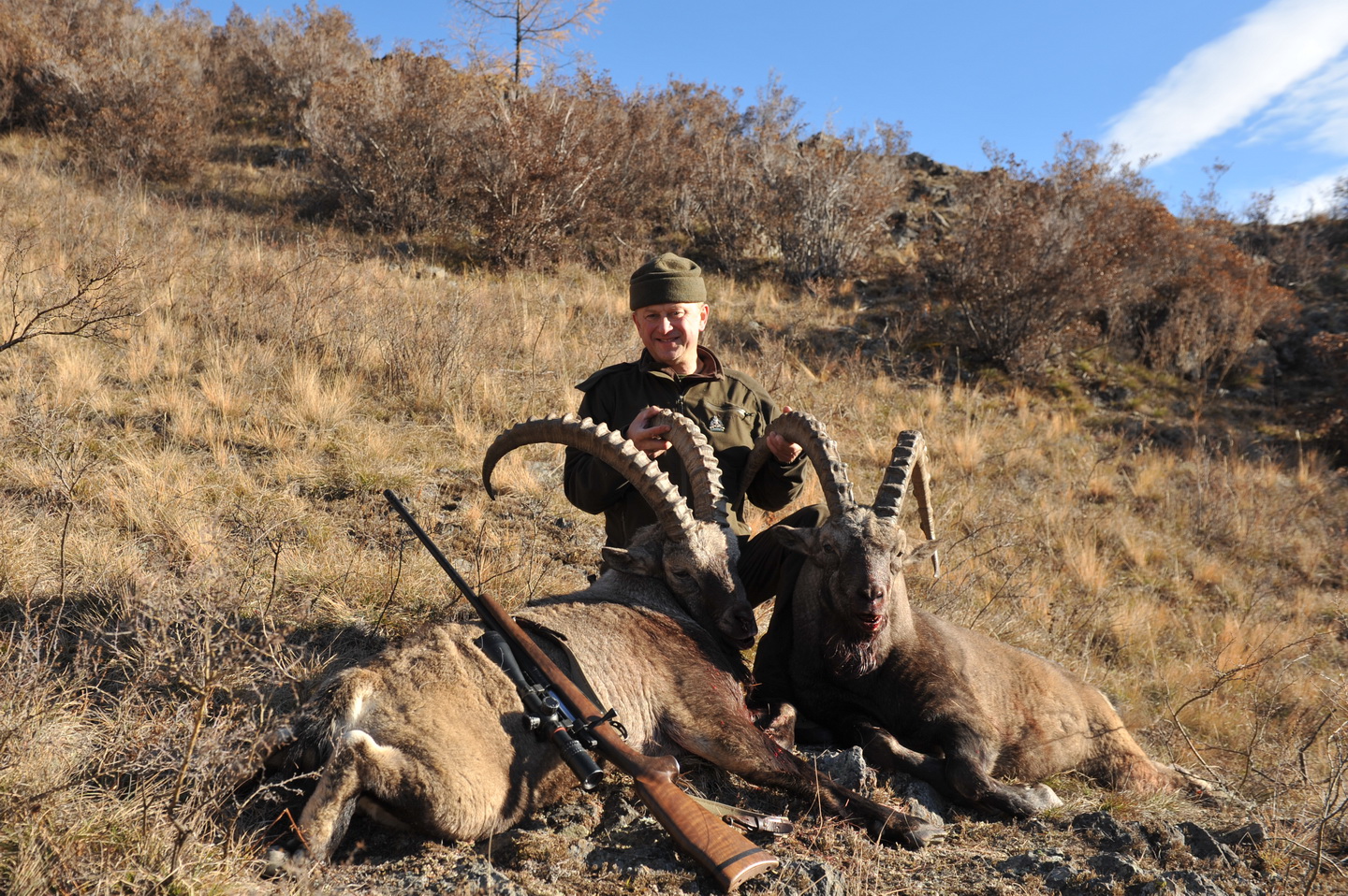 Главная интрига этой охоты заключалась в том, что Войтех Вячеславович добыл двух козерогов. После выстрела заметили более крупного самца. И естественно, он не удержался. Длина рогов второго самца составила 102 см, что для саянского козерога очень хороший результат. Вот так и получилось, что за один день охоты три охотника добыли четыре трофея. План перевыполнен на 133%. Вот что значит иметь дело с профессионалами, за что им большое спасибо!