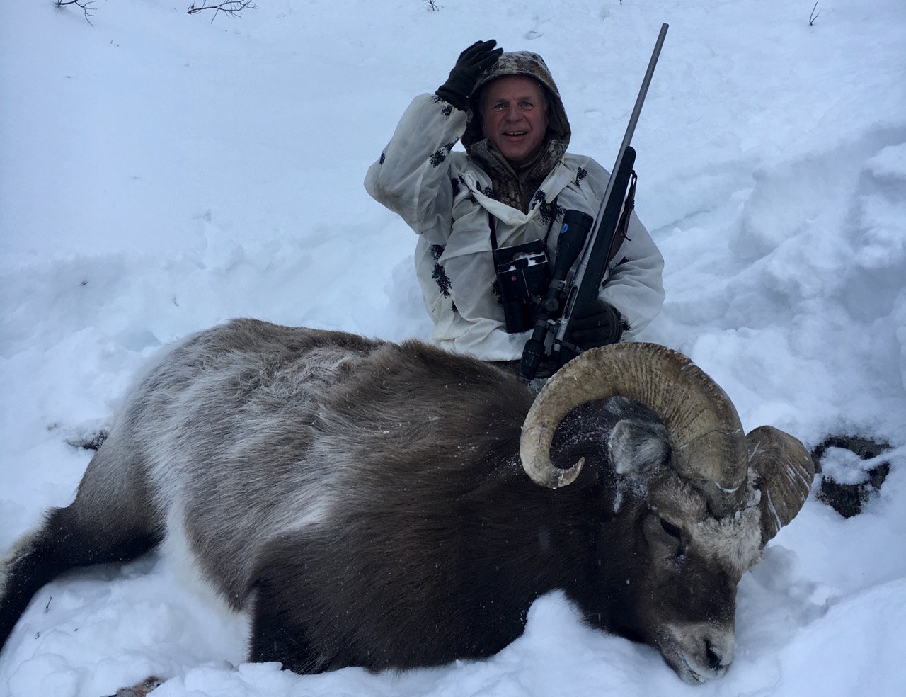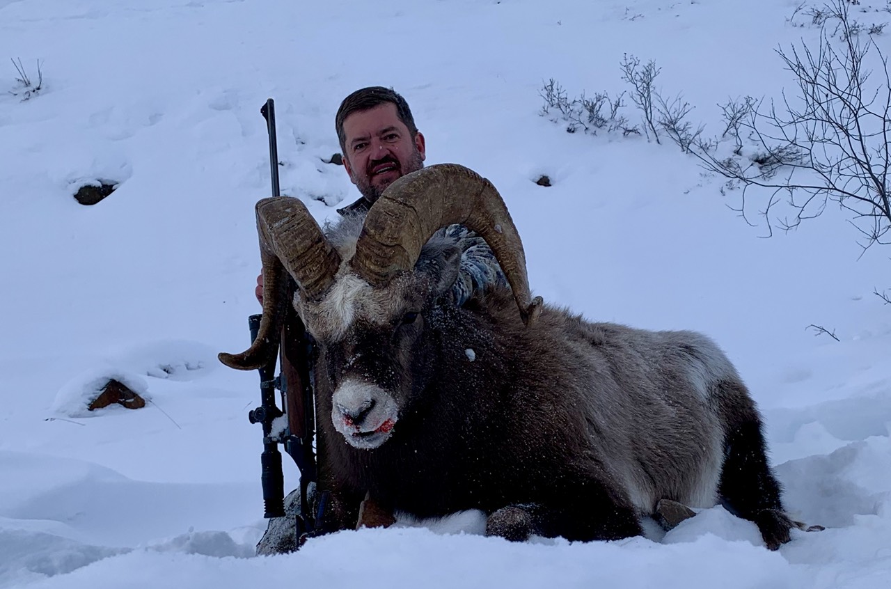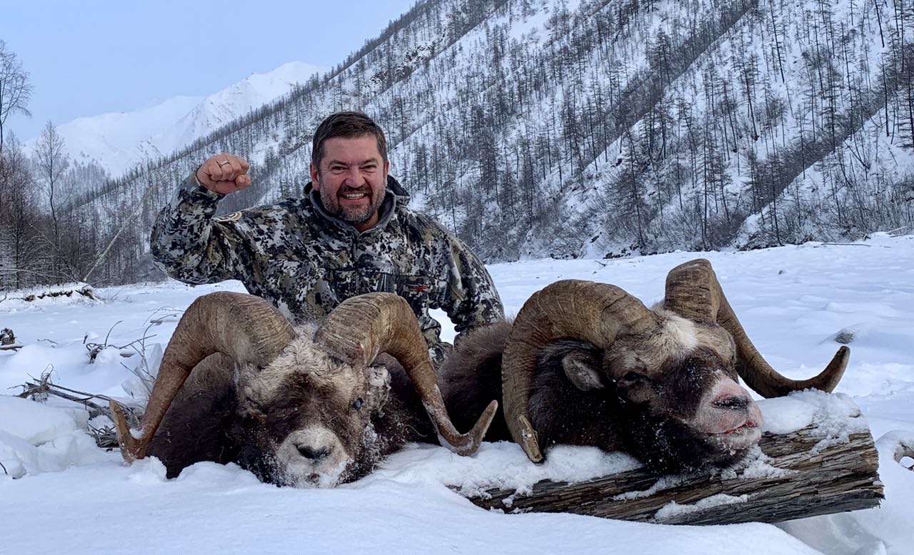 Пятый день нашей экспедиции. Первый день охоты. В семь утра выдвигаемся в горы пешком. Нас четверо, я, Костя и Василий с сыном Иваном. Сразу подъем вверх. Хорошая разминка с утра. На склоне много снега, иногда выше колена. Очень тяжело идти. Но, за два часа сделали подъем и вышли на хребет. Осмотр гор. Баранов нет. На хребте ветер. Хорошо нет мороза, минус 15*С не считается. Начинаем движение по скалам, в сторону группы Аркадьевича. Они по рации сообщили, что заметили стадо рогачей и двигаются к ним. И на нашем склоне есть трофейные самцы. Уже хорошо. Ветер и глубокий снег мешает быстро двигаться. Не знаю почему, но егеря торопят меня. Порой приходится ползти на коленках. Ибо проваливаешься в снег по самы… пояс. И тут слышим выстрел Сергея Аркадьевича. Эх, не много не дождались нас. По рации сообщают, что Аркадьевич добыл свой трофей, а бараны сбились в стадо и идут по распадку в нашу сторону. Надо ускоряться. Сил «буксовать» в снегу уже нет. А что делать? Идти вперёд. Если сегодня прозеваешь, завтра все опять повторится — подъем в гору, снег, ветер. Успел Ване дать короткий инструктаж, как снимать на видеокамеру. Мы с Константином делаем подход. И вот оно большое стадо, около 20 особей разного пола и возраста стоит внизу. Сразу слева замечаю рогача. Видно, что он здесь главный. Ждём Ваню с камерой. Вожак что-то занервничал. И переместился в центр стада. Тут справа налево пронёсся снежный порыв. И оптику и бинокль залепило снегом. Надо быстрее стрелять. Иначе бараны уйдут, или облаками их закроет. Нет времени ждать Ваню. Дистанция 278 метров. Стрелять надо вниз под углом градусов 45. Лёжа не получается, надо сидя с колена. Не очень устойчивое положение. Вылавливаю цель в оптику и выстрел. Есть шлёпок. Стада начинает движение вправо, мой баран влево и вниз. Точно, попадание было. Быстро перезаряжаюсь. В слегка залепленную снегом оптику нахожу барана. Выстрел. Пуля легла перед бараном. Дистанция увеличивается, а я не ввожу поправки. Баран уходит все дальше. Вниз распадка. Вот он пересёк реку и пытается взобраться на соседний склон. Не получается, падает вниз. Мы быстро начинаем спускаться вниз. Видим баран лежит возле одинокого дерева. И вот он снова подымается и …. идёт вверх. Надо стрелять, может уйти. И бегай потом по горам за подранком. Дистанция 368 метров. Костя даёт свой рюкзак в качестве упора. Выстрел. Есть попадание. Но, баран остаётся стоять на месте. Ещё выстрел. Промах. Надо собраться. Надо сделать один хороший выстрел. Максимально концентрируюсь. Шнеллер. Выстрел. Отчетливо слышим попадание. И баран, как подкошенный падает вниз. Ура, наконец-то добыт. Костя, говорит, что я заставил их понервничать.
