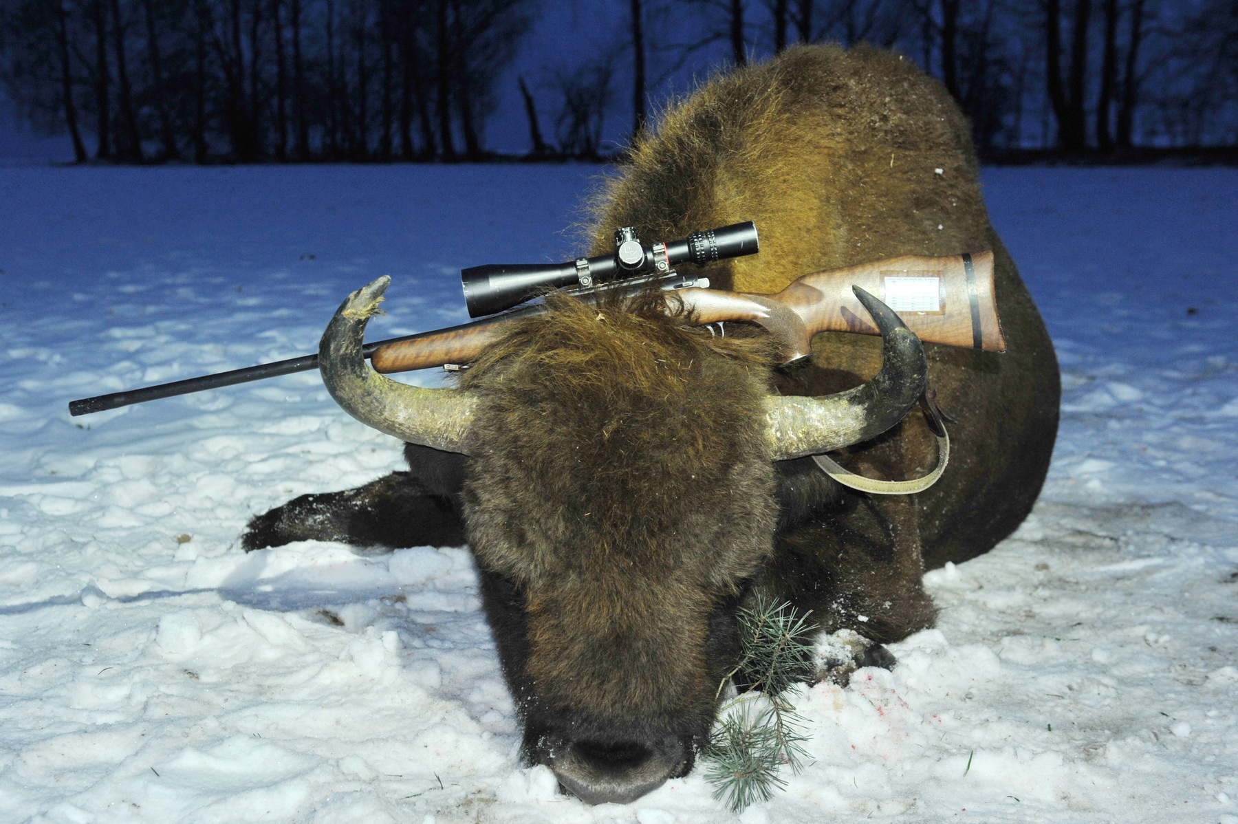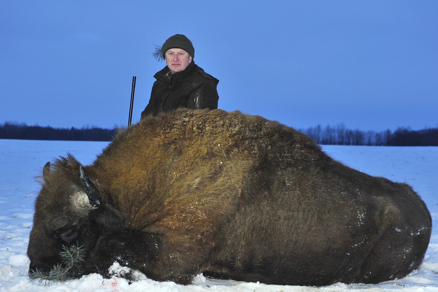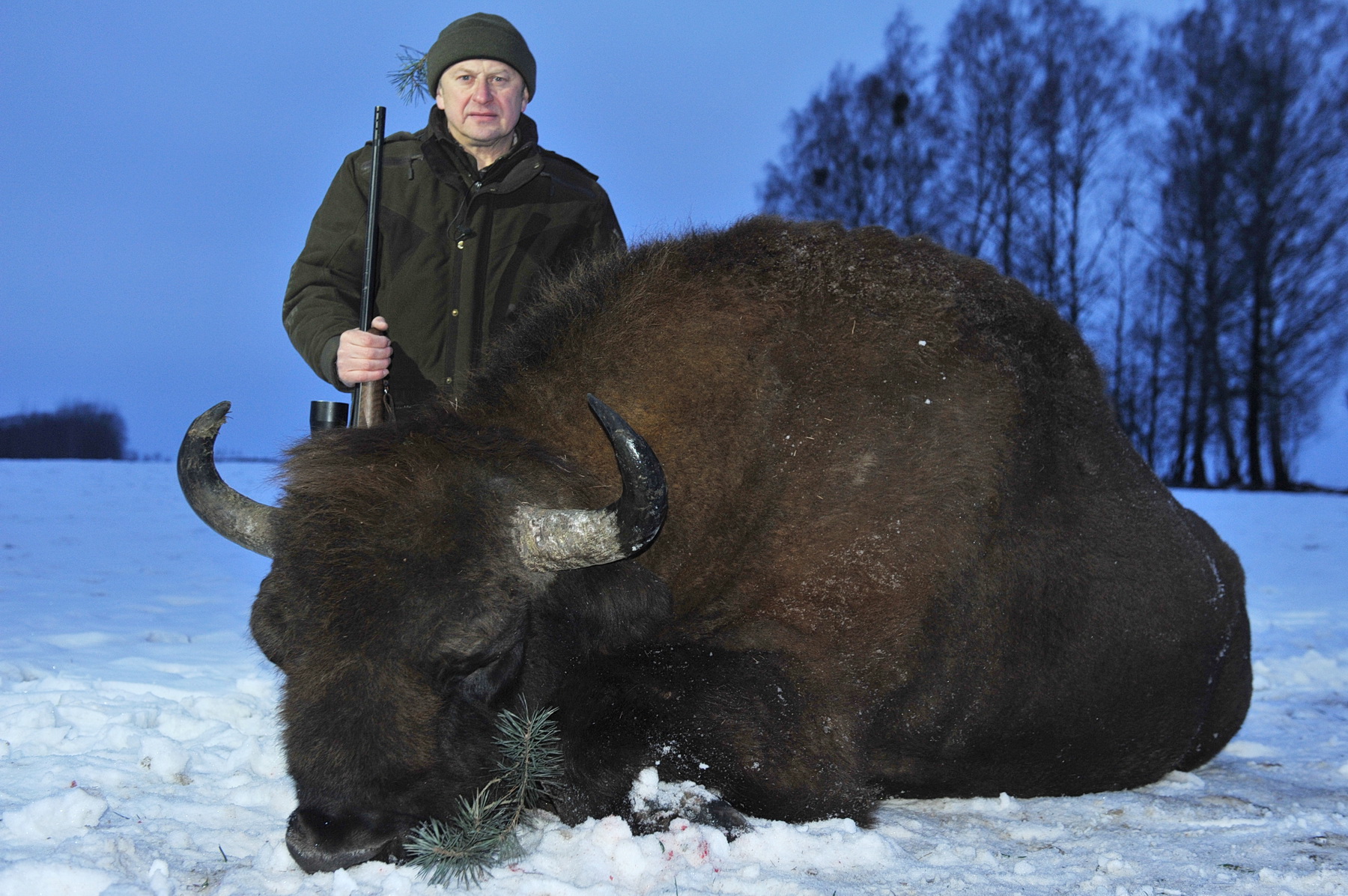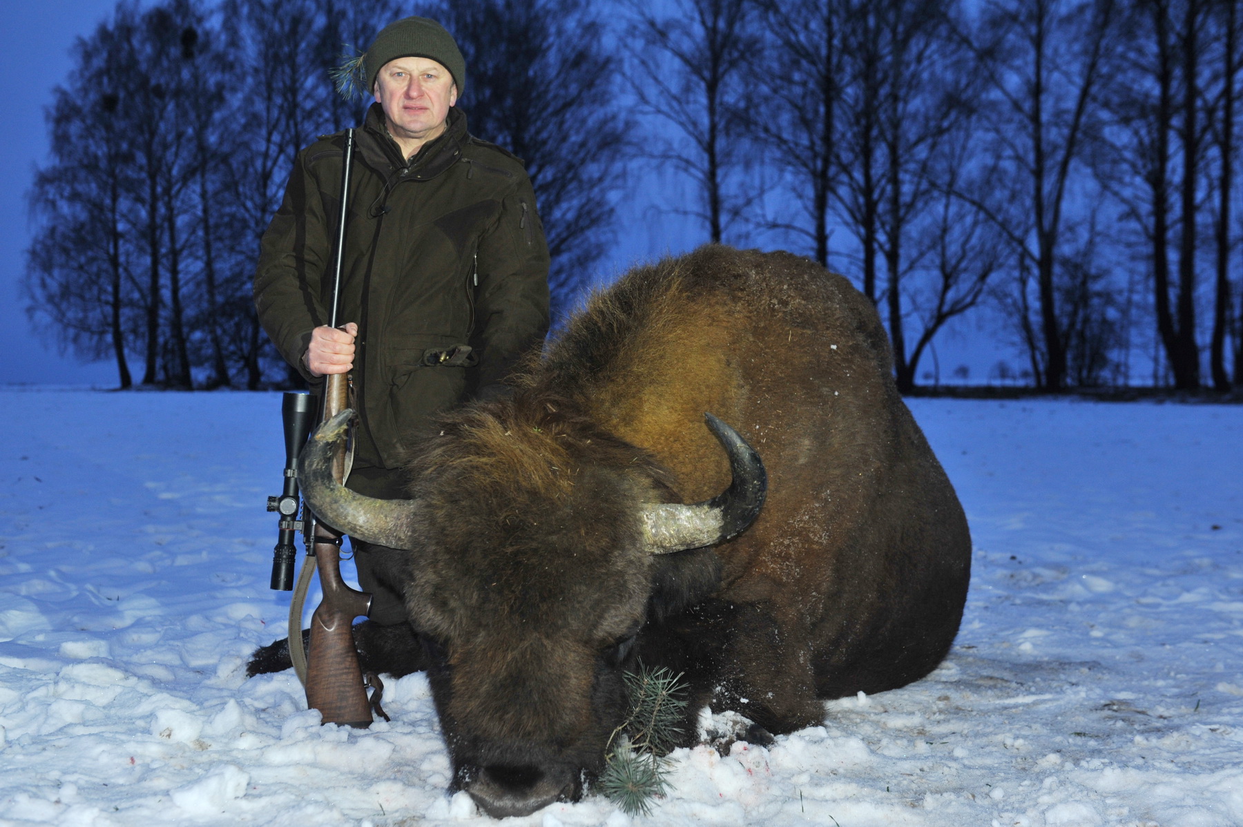 Все в ожидании выхода зверя. Немного отвлеклись на пасущихся в 300-стах метрах 10-ти косуль на фоне красивейшего заката солнца. Так всех захватила такая чудесная панорама, что не заметили, как на середину поля вышли 3 зубра. Впереди огромной горой – НАШ. Зубровод Алексей, сильно волнуясь, громким шепотом предлагал побыстрей стрелять, иначе зверь, почувствовав нас, уйдет. Я понимал, что богиня охоты «Диана» сегодня на моей стороне и не торопился сделать неверный выстрел. Тем более затрудняло удачно выстрелить по месту межа между 2-х полей, заросшая деревьями. Т.е. зубр на одной стороне, наша группа – на другой. Бык долго смотрел в нашу сторону. Мы, кто сидя, кто стоя, застыли. И когда зверь повернул голову в сторону своих спутников, я быстро переместил треногу на полметра левее, найдя в стене из деревьев и веток небольшое свободное окно и выстрелил. Зверь развернулся и побежал в сторону леса, но через метров 20-ть остановился. Я в это время тоже бежал наперерез, пересекая заросшую межу. С колена, держа в прицеле убойное место зверя, сделал контрольный выстрел. Зверь медленно опустился на колени ….