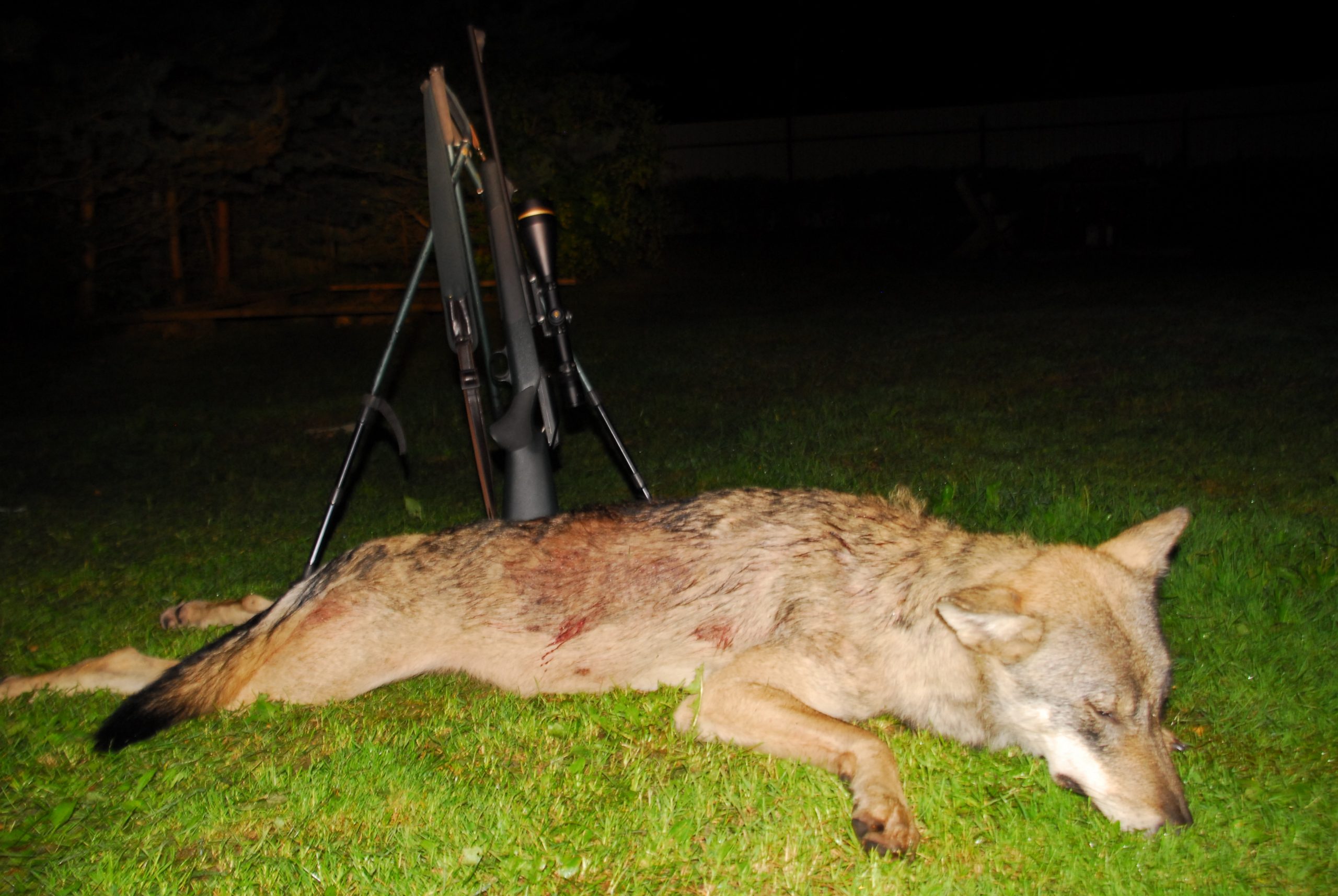 Незаметно прошла рабочая неделя и я снова оказался в здешних местах. И снова поехал вабить, решив опять начать с сенокосов. Вот только чуть-чуть припозднился по времени. Поэтому оставив машину в своем обычном месте, я прямо от нее «проскулил» и отправился занимать позицию среди все тех-же рулонов. Пройдя около четырехсот метров,я пробрался сквозь коридор кустарника и оказался на краю поля. Прежде чем идти дальше, решил осмотреться в бинокль. Волка прямо посреди поля я увидел сразу. Хищник сосредоточенно двигался в сторону машины, неминуемо приближаясь ко мне. Когда до зверя оставалось 150 метров я выстрелил. Все произошло как-то быстро, буднично и пресно. Еще одна волчица отправилась в царство вечной охоты…